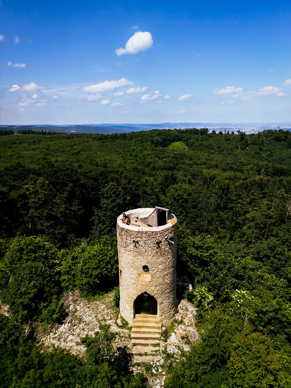 Anders als bei anderen Aussichtswarten betritt man den steinernen Turm über eine Türe und steigt auf eine alten Holzstiege hinauf auf die runde steinerne Plattform.