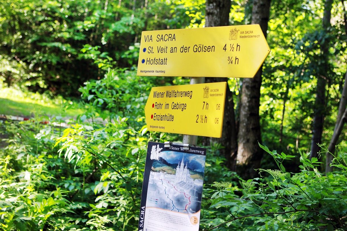 - Route description Day 1 stage: Perchtoldsdorf or Vienna-Rodaun to MayerlingStage length: 17.9 km, ascents: 678 m, descents: 613 m, walking time: 07:00 hThe path begins in Perchtoldsdorf at the parish church and leads via the Pastor Karl Seemann Promenade into the Föhrenberge Nature Park to Parapluieberg (Franz Ferdinand shelter, 01:15 h). Through light deciduous woods, it continues via Kammersteiner hut, Kugelwiese and Seewiese – passing Wildegg Castle – to Sittendorf (03:00 h). Via the Füllenberg dairy one comes to the motorway underpass, behind which lies the Heiligenkreuz cemetery. From the cemetery one is soon at the baroque Calvary of the Heiligenkreuz abbey, over which one reaches the abbey in a few minutes (01:30 h). From the abbey one finally reaches Mayerling (01:15 h).Variant Vienna-Rodaun: In this variant one comes from Vienna-Rodaun (terminus tram line 60) via Schiller Promenade into the municipality of Perchtoldsdorf and goes – past the forest sanatorium – to the Perchtoldsdorf heath. At Parapluieberg one meets the ascent coming from Perchtoldsdorf. Day 2 stage: Mayerling via Klein-Mariazell to KaumbergStage length: 24.9 km, ascents: 855 m, descents: 697 m, walking time: 09:00 hFrom Mayerling paved paths or field paths lead to Maria Raisenmarkt. It continues through the forest to Holzschlag (@ 02:00 h) and over Nöstach to the pilgrimage church Hafnerberg (01:15 h). The Vienna Pilgrim Way leads from Hafnerberg via beautiful high paths to the active Klein-Mariazell abbey (02:00 h) and further to Kaumberg (03:45 h).Southern variants via Peilstein to Rohr im Gebirge: From Holzschlag to Peilsteinhaus, over Neuhaus to Weissenbach on the Triesting and to Furth/Schromenau (03:45 h). Here further path division – direct route through Further- and Staffgraben, steep ascent to Kieneck with the Gentian hut (04:00 h) and to Unterberghaus (02:45 h). Easier is the hike in Steinwandgraben via the Jagasitz/Kreuth inn to Thal in Muggendorf and to Unterberghaus (Schromenau – Unterberg 06:30 h). Attention: the southern variants require a different stage division of the overall route.Valley variant Via Sacra to Kaumberg: From Hafnerberg the Via Sacra runs via Altenmarkt and Thenneberg to Kaumberg. Day 3 stage: Kaumberg to RohrStage length: 24.9 km, ascents: 1,309 m, descents: 1,118 m, walking time: 10:45 hThis stage is demanding and requires stamina and fitness: over the mountains several ascents and descents in total 1,309 ascent meters and 24.9 kilometers length! From Kaumberg you comfortably reach the picturesque ruins of Araburg. Shortly after, the Vienna Pilgrim Way leaves the common route with the Via Sacra (which continues into the Gölsental to Hainfeld) and turns south towards Rohr im Gebirge. There follows a longer lonely ridge hike with steep ascents over Veiglkogel and Reingupf to Kieneck with the Gentian hut (04:45 h). You are now on alpine terrain over 1,000 meters above sea level. Caution in bad weather. After the Gentian hut the route continues on alpine terrain to Bettelmann cross and the shelter on Unterberg (02:45 h). Here you have reached the alpine high point of this tour. Now it goes over forest paths down to the valley to the former inn Gries and alongside the road further to Rohr im Gebirge (03:15 h). Day 4 stage: Rohr to St. AegydStage length: 20.6 km, ascents: 603 m, descents: 694 m, walking time: 07:15 hA simple hiking trail leads from Rohr im Gebirge to Kalte Kuchl in Kleinzell with the Alpine inn Rieder (01:45 h). Attention: in good weather there are many motorcyclists here! From now on begins a hike in a scenically beautiful but very secluded area without catering options. From Kalte Kuchl with little altitude difference via Werasöd into the lonely grounds of the Green and Dry Schwarza (01:30 h). From Tiefental it goes through the Finstergrundgraben to the first slightly hilly upward section of this stage, over a saddle past the neobaroque castle Hochreit built in 1888 by Wittgenstein with a view into the Traisen valley (01:30 h). Over the Hochreit farm in Amt Mitterbach one reaches the Seebach valley. From the Mosbach farm one takes the local road to St. Aegyd, passes the station and soon reaches the center of St. Aegyd (02:30 h). Day 5 stage: St. Aegyd to MariazellStage length: 27.1 km, ascents: 869 m, descents: 586 m, walking time: 09:15 hThe forest ditch of the Unrechttraisen leads – increasing more steeply only at the end – to Kernhofer Gscheid (03:30 h). From St. Aegyd there is also the option to reach Gscheid via Kernhof. After Gscheid follows a road section, after which one turns into a forest road and enters Walster valley via Krumbach saddle (junction of Falkenschlucht trail from Türnitz). The route continues along Hubertus lake (on asphalt) to Bruder Klaus church (02:30 h). From here one walks westwards in Walster valley to the turnoff to the moderately strenuous Habertheuersattel. Once there, one descends to Sebastiani path and Rosary path and continues on this to the Mariazell pilgrimage church (03:15 h from Walstern).