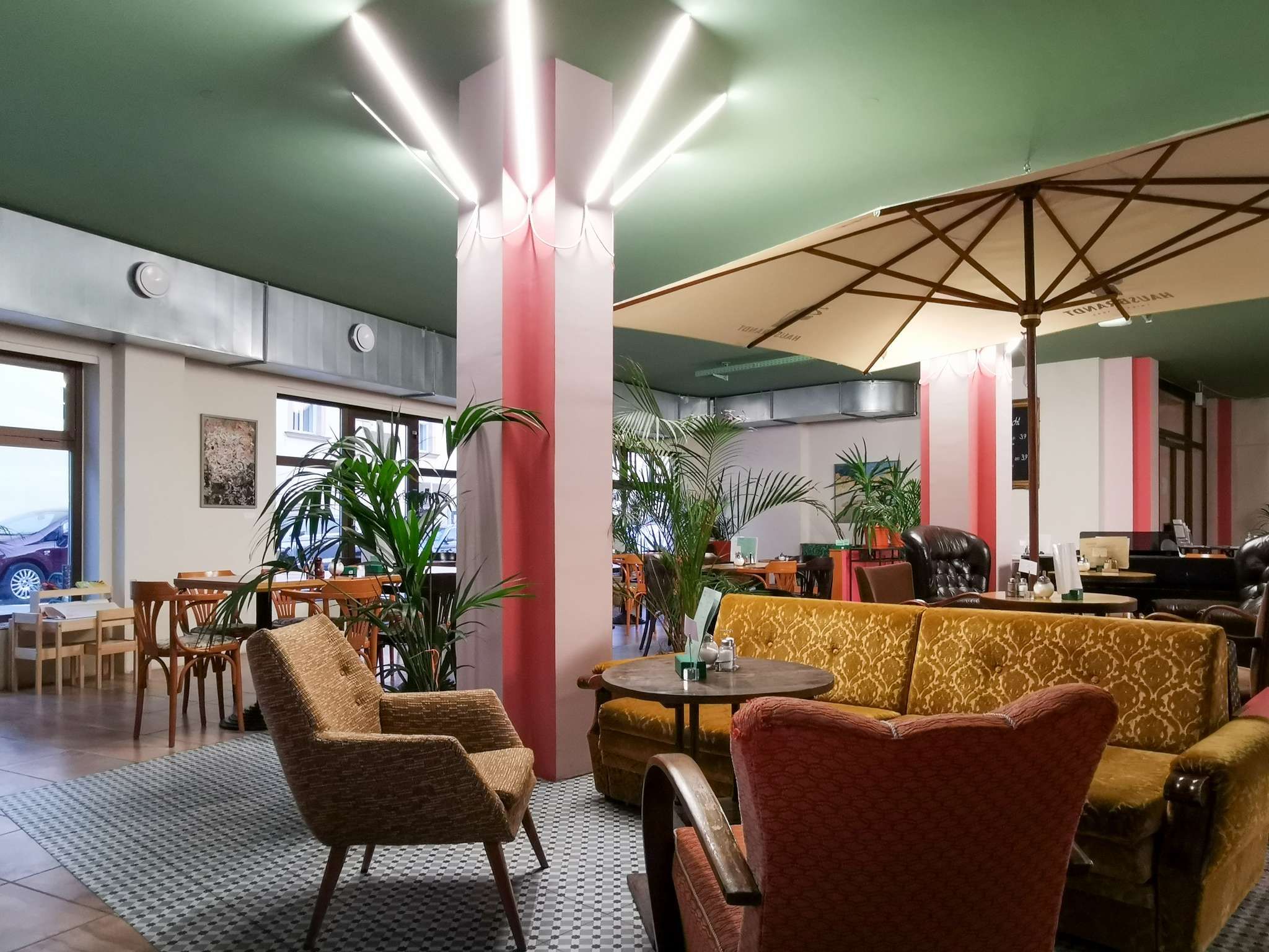 Zwischen Palmen und gemütlichen Sofas findet im offenen Gastraum mit den großen Fenstern jeder seinen Lieblingsplatz. Und im schattigen Schanigarten mit Blick aufs Stift Klosterneuburg sowieso. Ein eigens buchbarer Veranstaltungsraum bietet Platz für private Feiern oder Seminare.“