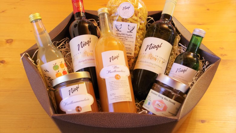 - Eine Vielzahl an individuell zusammengestellten Geschenkvariationen mit Ihren Lieblingsprodukten wie Weinen, Honig, Marmelade, Nudeln und Obst-Schmankerln (Beispiel Pakete siehe Foto) erhalten Sie beim Weingut Niegl aus Brunn am Gebirge. Hier geht´s zum Online Shop.