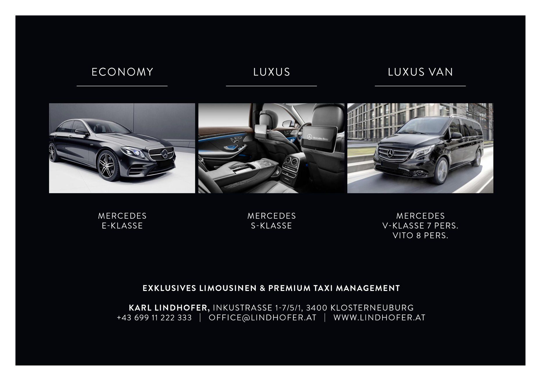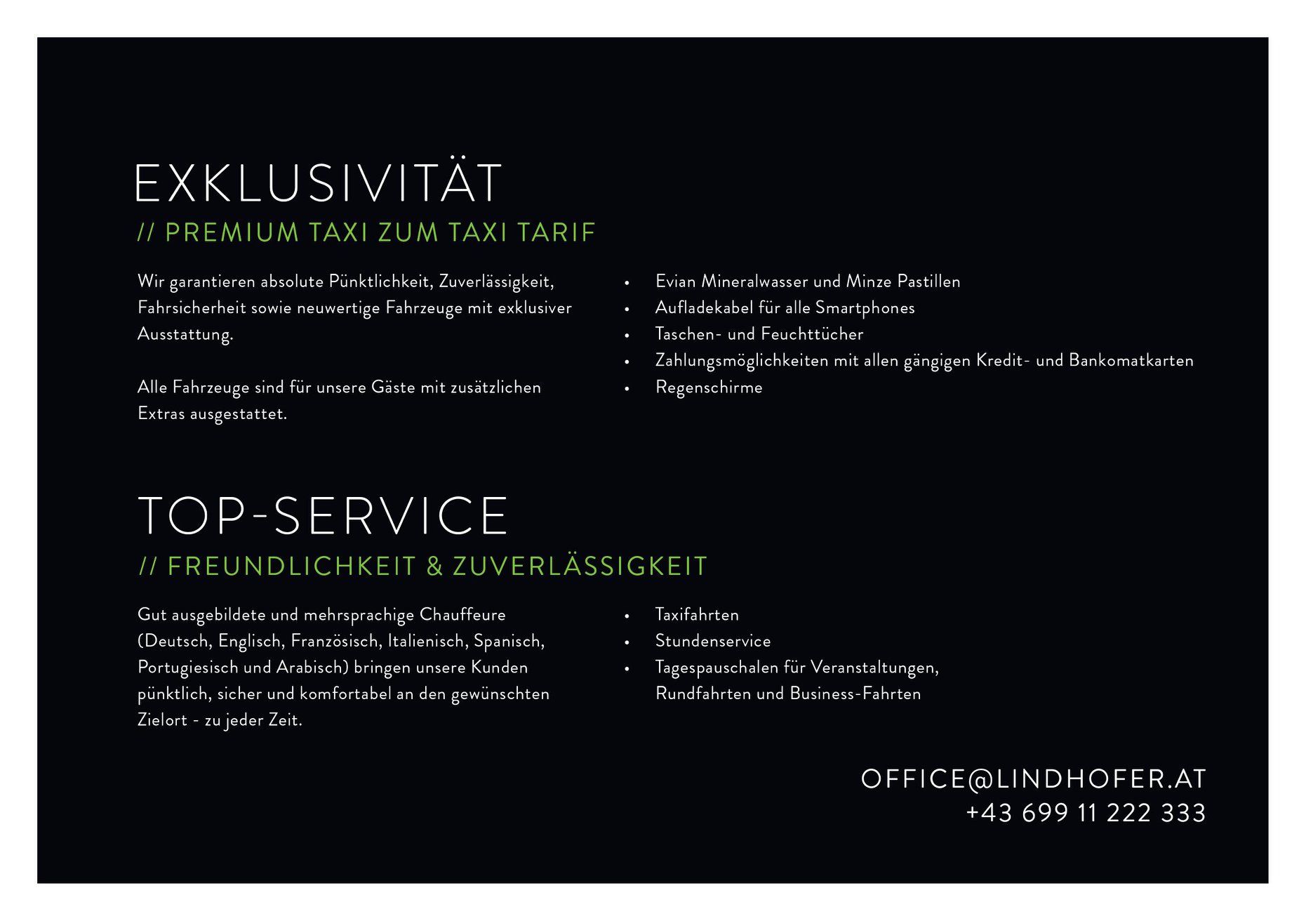 Exklusiver Chauffeur Service Lindhofer wurde mit dem Ziel gegründet, erstklassige Transfers mit wertorientierten Preisen und kompetentem Kundenservice anzubieten. Seit über 15 Jahre erfüllen wir unsere Gründungsmission. Aufbauend auf dem umfassenden Branchenwissen unserer MitarbeiterInnen und moderaten Preisen bieten wir unseren Kunden weiterhin einen außergewöhnlichen Wert.