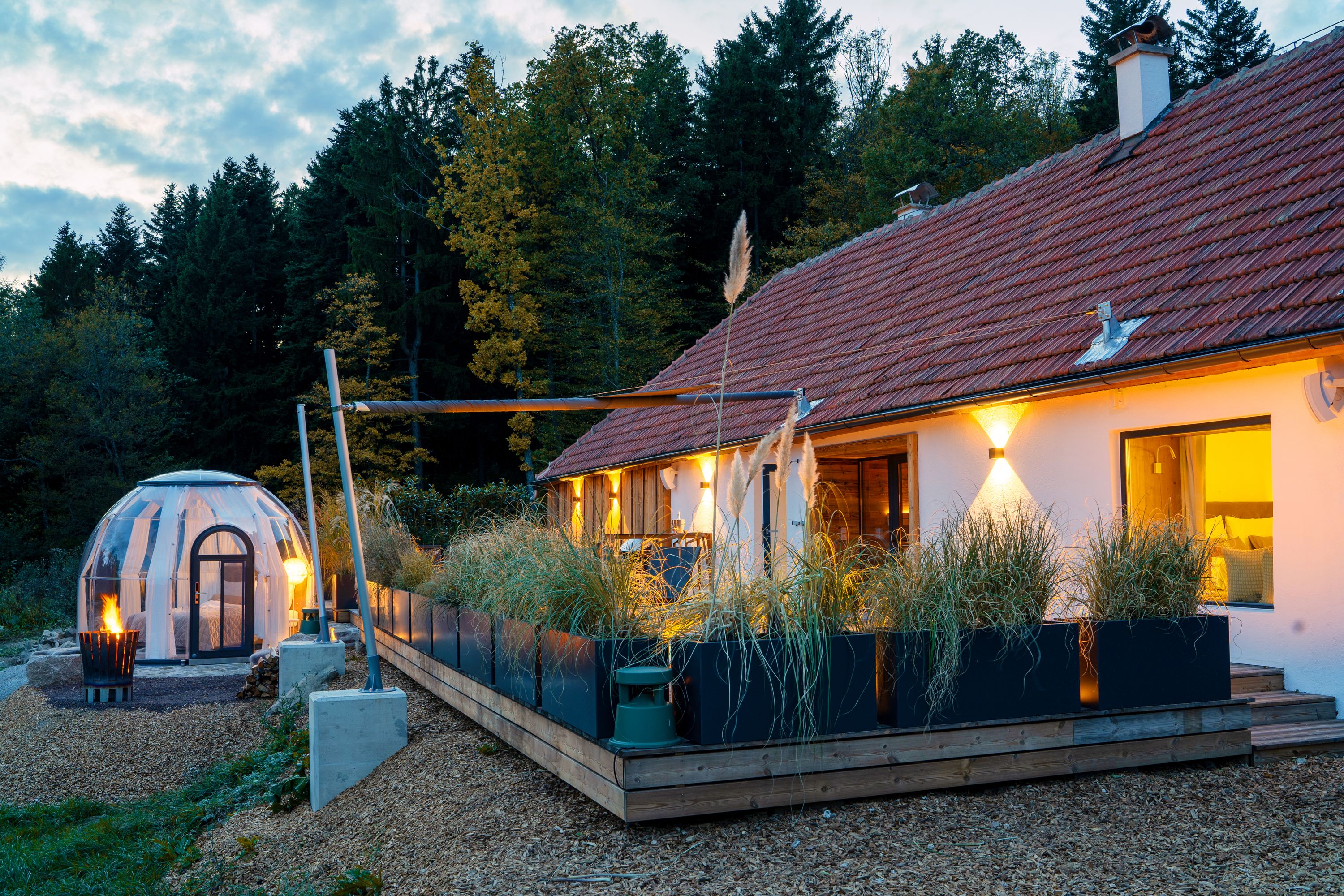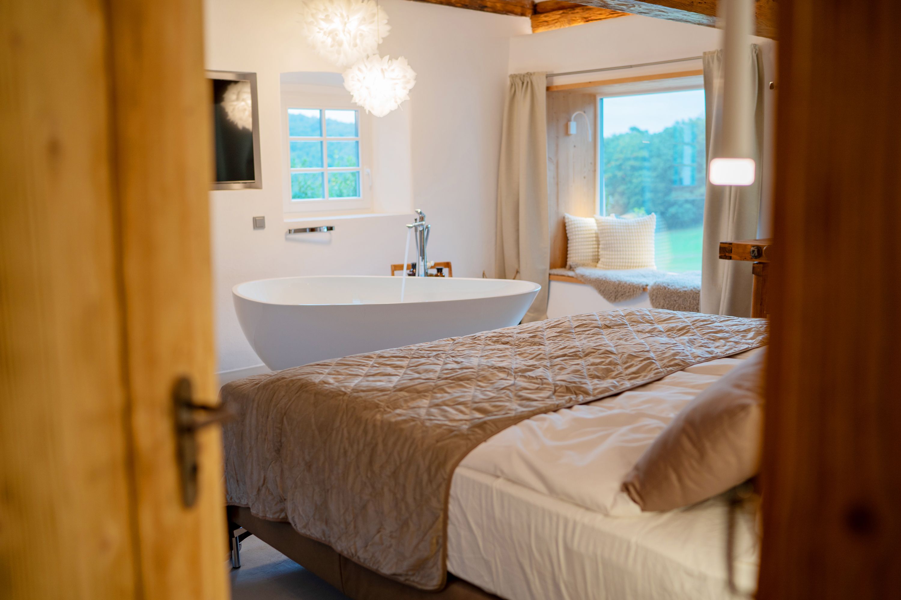Umgeben von Wäldern, Wiesen und Weiden versteckt sich ein kleines Häuschen. Einst einfache Übernachtungsmöglichkeit für Bauern. Jetzt Luxus pur inmitten der Natur: Direkt im Schlafzimmer gibt es eine freistehende Badewanne mit Panoramablick ins Grüne, wo höchstens die eine oder andere Kuh herumgrast. Die Sauna und den Whirlpool auf der Terrasse genießt man völlig ungestört – zu jeder Tages- und Nachtzeit. Eine Küche mit allem Drum und Dran sorgt dafür, dass man nicht nur von Luft und Liebe leben muss. Und weil wirklich an jedes Detail gedacht wurde, geht es zum Einkaufen einfach in den Weidehausladen im angrenzenden Stadl.