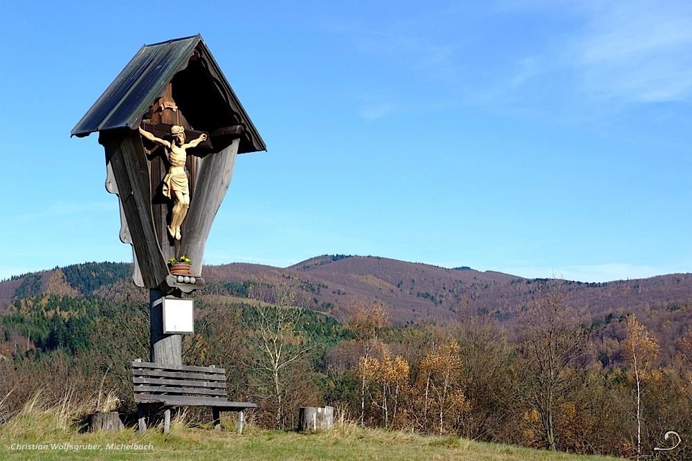 Mit Proviant aus Susi’s Kaufladen, der kleinen Greißlerei, eingedeckt, geht’s zwischen Gasthof zur Glashütte und Gastgarten die Asphaltstraße aufwärts. Nach 150 m biegen wir links in einen nicht markierten Weg, entlang eines typischen Wienerwald-Grabens wandern wir bergan. Vor einer Fichtenkultur dreht der Pfad leicht nach links, bald zeigen sich die malerisch gelegenen Anwesen Klein- und Großleiten. Diese passieren wir, den Karrenweg beibehaltend, vorbei an einem Reservoire, hinauf zum „Roten Kreuz“. Der weiß/grün/weißen Markierung nach Westen folgend führt der Weg Richtung Stollberg (Wegweiser), wir übersetzen einen Forstweg und tauchen durch eine dunkle Fichtenkultur hinaus zur Hirschbachwiese, auf der uns zwischen zwei Lärchen das „Schwarze Kreuz“ erwartet. Den aussichtsreichen Höhenrücken weiter, an einer schönen Solitäreiche vorbei, bis der Feldweg knapp vor der Stollberger-Anhöhe links wegdreht, hier übersetzen wir rechts hinunter zum Gasthof Kreuzwirt.