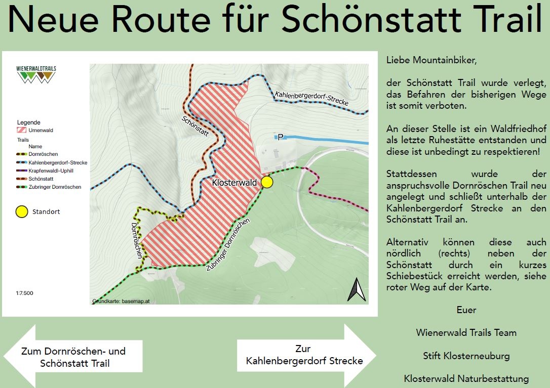 Der Schönstatt Trail wurde verlegt und das Befahren der bisherigen Wege ist somit verboten. An dieser Stelle ist ein Waldfriedhof als letzte Ruhestätte entstanden und dieser ist unbedingt zu respektieren! Stattdessen wurde der anspruchsvolle Dornröschen Trail neu angelegt und schließt unterhalb der Kahlenbergerdorf Strecke an den Schönstatt Trail an. Alternativ können diese auch nördlich (rechts) neben der Schönstatt durch ein kurzes Schiebestück erreicht werden.
