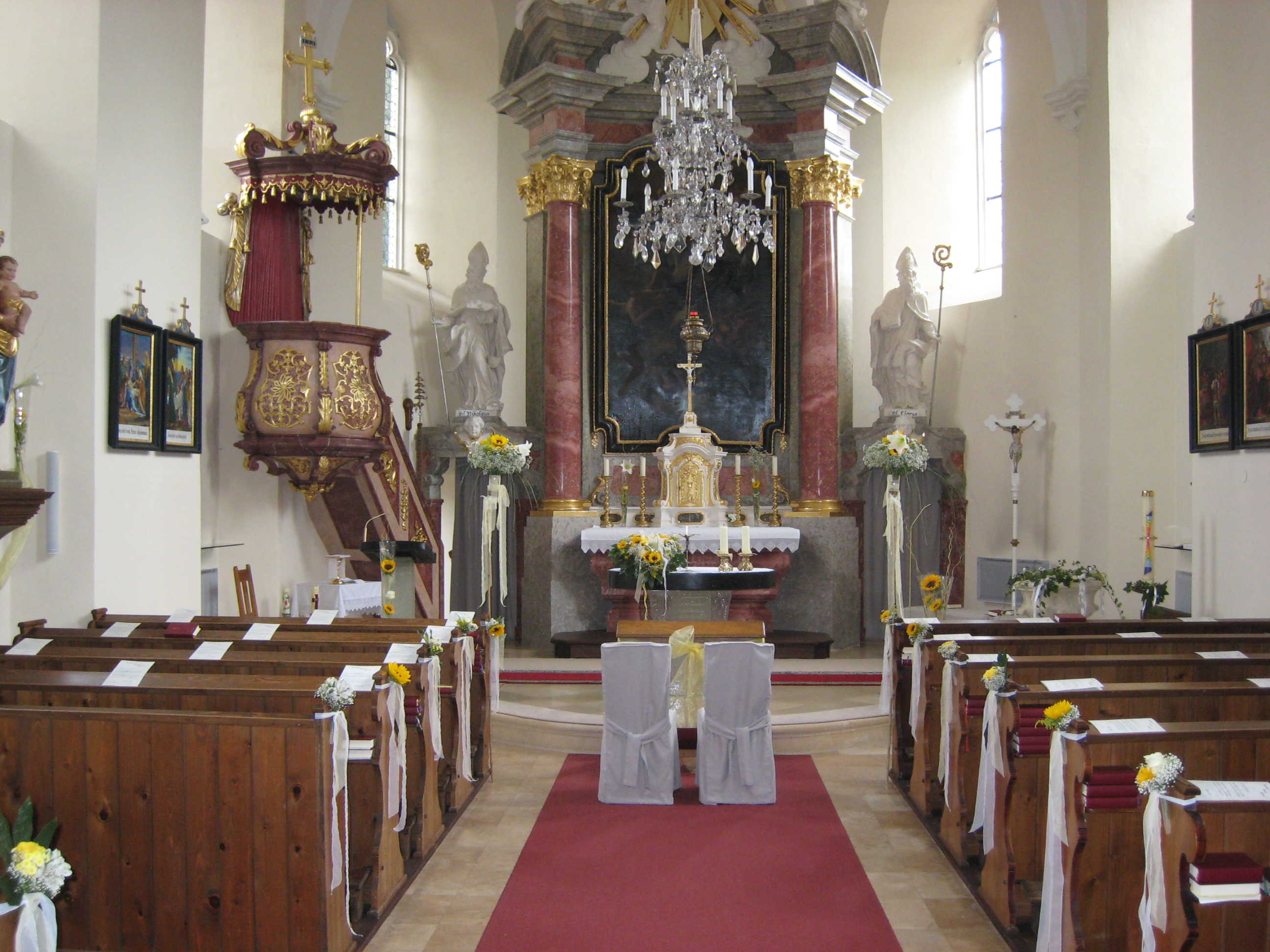 Die Kirche und der Pfarrsaal wurden zuletzt von 2004 bis 2006 renoviert. Unter dem Leitspruch: “Gott ist das Licht“ wurde die Pfarrkirche hell und freundlich gestaltet. Sie bietet Platz für ca. 100 Personen, hat eine restaurierte Orgel und ist dem Hl. Johannes von Nepomuk geweiht.