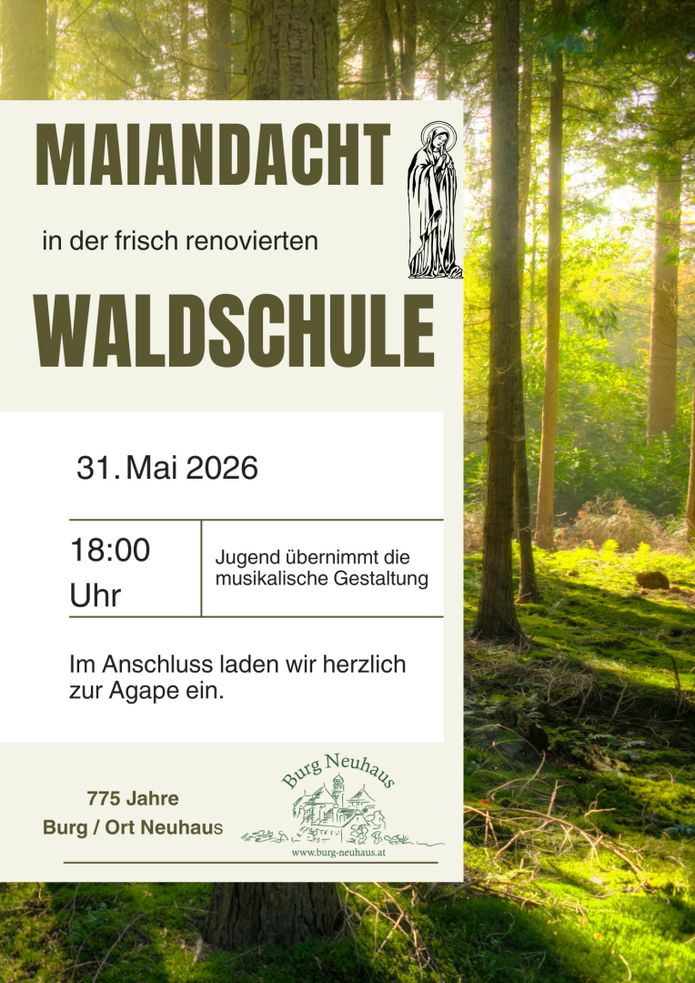 Maiandacht in der Waldschule Maiandacht in der Waldschule NeuhausJugend übernimmt die musikalische GestaltungIm Anschluss laden wir herzlich zur Agape ein