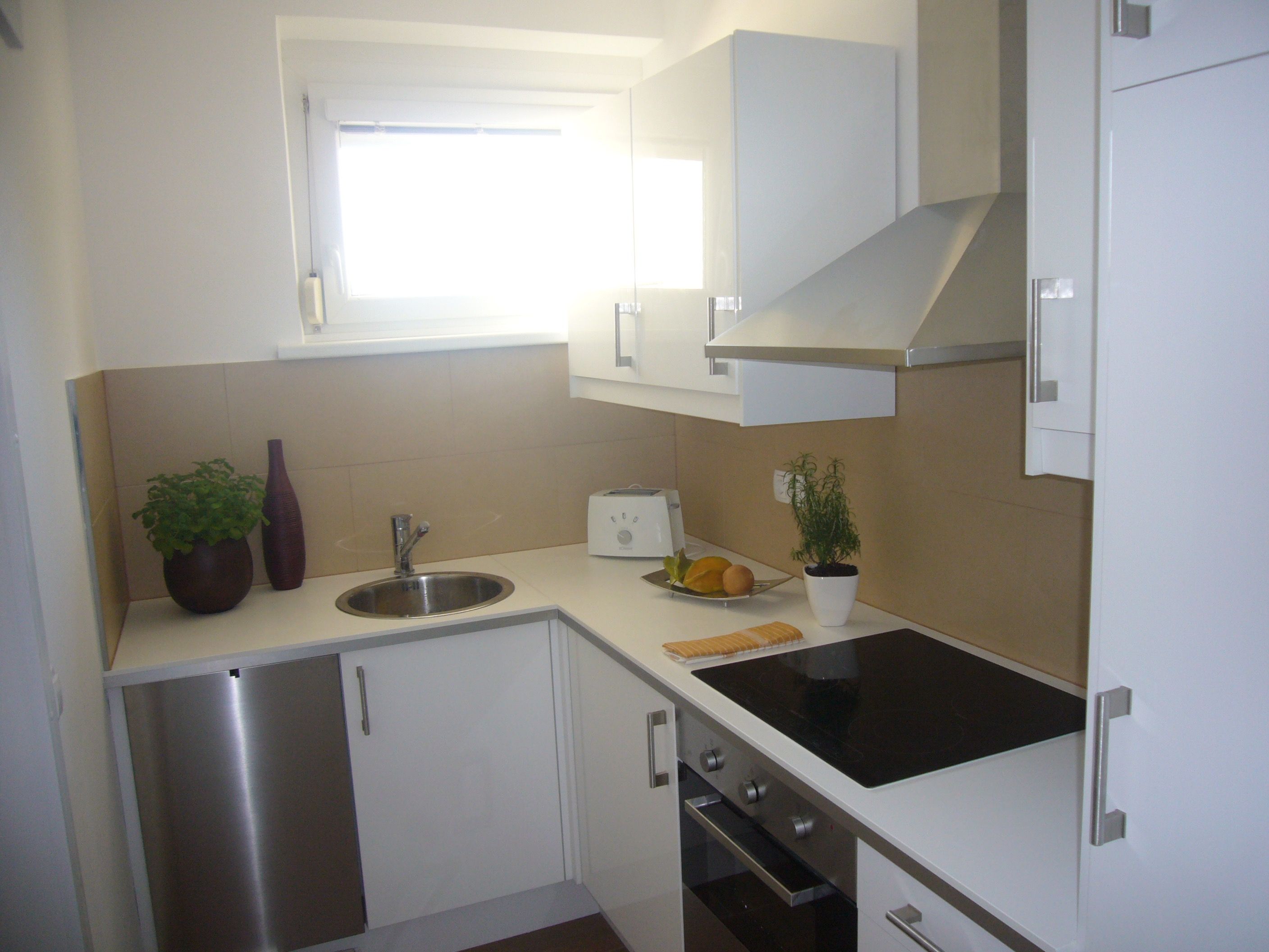 Die voll ausgestattete, moderne Küche inkl. Geschirrspüler und Induktionsherd ist mit einer Durchreiche mit dem Wohnzimmer verbunden.
