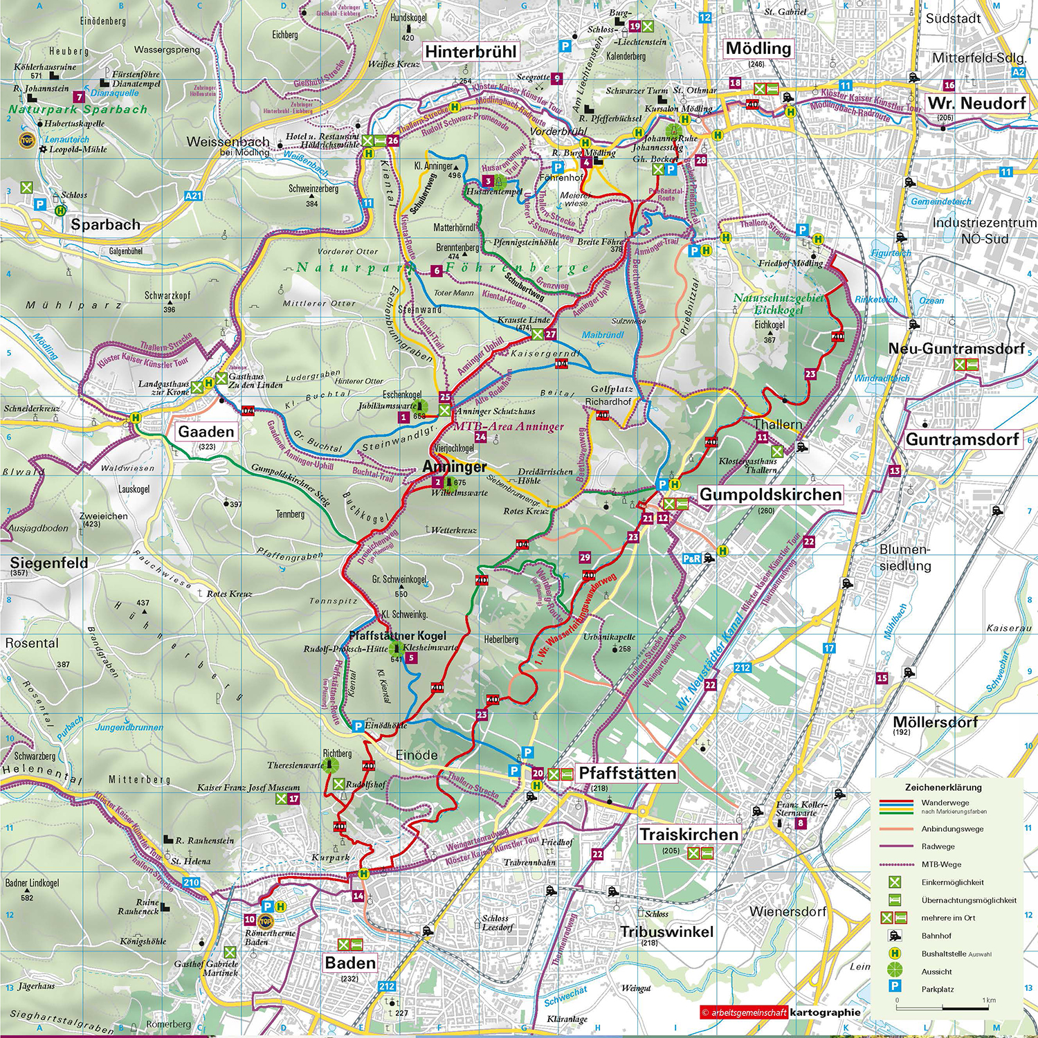 Eine Wanderung zur neu renovierten Kaiser-Jubiläumswarte am Eschenkogel lohnt sich. Auf der 20 m hohen Aussichtsplattform wartet ein eindrucksvoller Rundumblick, der sich vom Anninger über große Teile des bewaldeten Wienerwaldes, die Thermenregion Wienerwald und bis hin zum Schneeberg erstreckt.